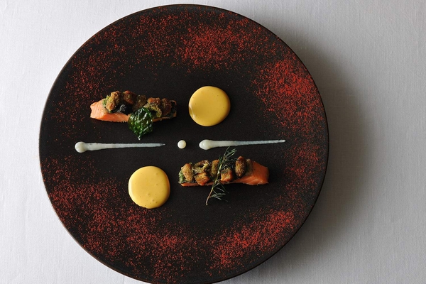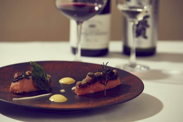 イタリア料理を提供するメインダイ二ング「OTTO SETTE(オットセッテ)」で、前菜からデザートまですべてに発酵食品を使用した5品の特別ディナーコース「Aroma」を提供します。山梨県・長野県で発酵食品を作る方々のご協力のもと、大豆テンペやホワイトバルサミコ、桃のピクルス、玄米甘酒などコース全体で12の発酵食品を使っています。ワインは約2,000本を誇るワインセラーから発酵食品の個性を引き立てるワインをセレクトし、一皿ごとにペアリング。さらに、日本酒やウイスキーなど山梨県の銘酒も合わせ、幅広いマリアージュを楽しめます。例えば、塩麹に付け込んだ鱒に、ふっくらとした食感の「曙大豆」や深い風味が特徴の「にんにくノワール」を添えた温前菜に合わせるのは「ストラトゥキャッセ(ファンキーシャトー/長野県青木村)」です。セミヨン種が持つしっとりとした果実味とオイリーな質感が鱒の食感と同調し、味わいの広がりを感じるマリアージュを楽しめます。
