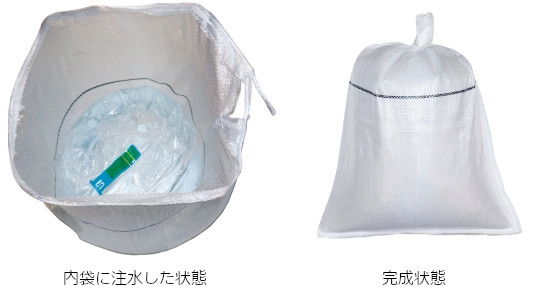 「内袋」(逆止弁付き袋)を「外袋」(土のう袋) にセットして水を入れるだけ。