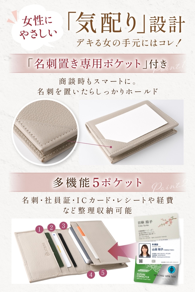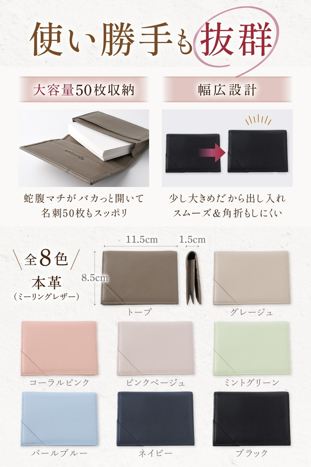 大容量50枚収納・幅広設計で名刺交換のストレスを解消