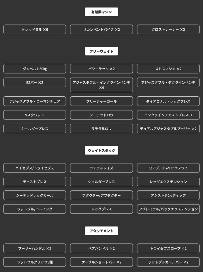 パワーラックやスミスマシン、エアロバイク、トレッドミルなど、多様なマシンを完備しています。