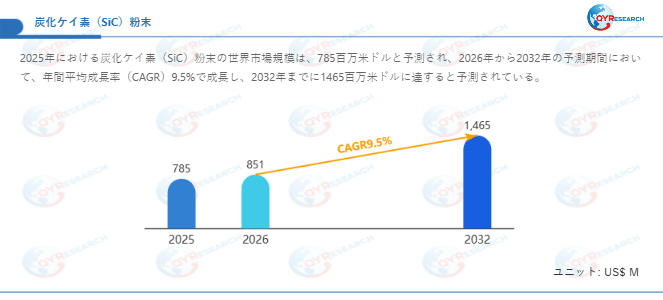 QYResearch調査チームの最新レポート「炭化ケイ素(SiC)粉末―グローバル市場シェアとランキング、全体の売上と需要予測、2026~2032」によると、炭化ケイ素(SiC)粉末の世界市場は、2025年に785百万米ドルと推定され、2026年には851百万米ドルに達すると予測されています。その後、2026年から2032年にかけて年平均成長率(CAGR)9.5%で推移し、2032年には1465百万米ドルに拡大すると見込まれています。