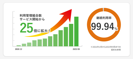 クラセルを活用した自主管理プランから、管理会社がクラセルを活用して効率的に管理業務を行うプランまで様々な管理方式を選択でき、費用は1マンションあたり月額16,500円(税込)~のため、圧倒的な管理コスト削減が実現でき、サービス開始以降、順調にユーザー数を伸ばし続けています。