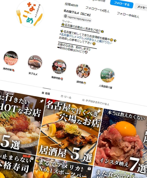 A、Instagramで年間150万人に見られている『名古屋グルメ【なごめ】』というグルメメディアを運営している外部団体に所属しています。