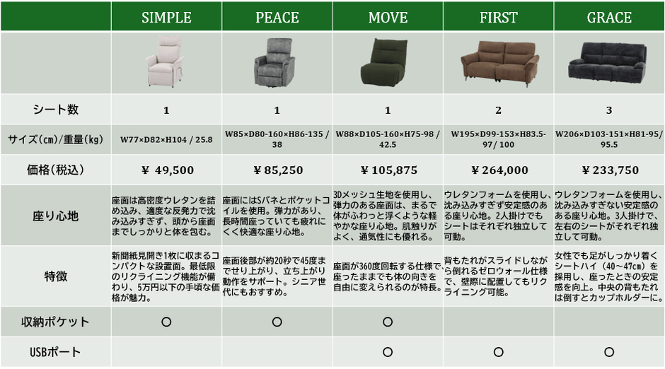 当社の電動リクライナーは、ライフスタイルの多様化に対応して5つのモデルを展開しています。