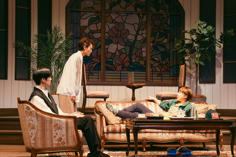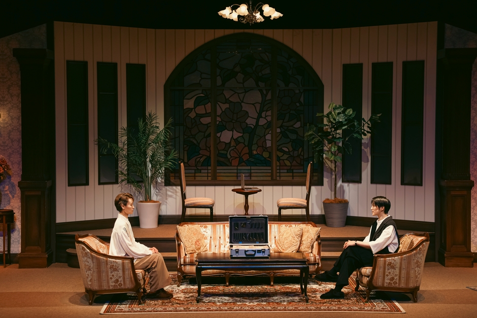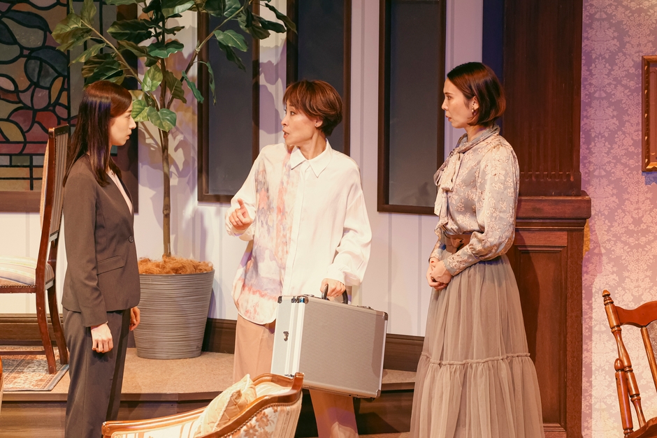 失踪した夫を探す主婦ミツキ(寿)と、ミステリアスな謎の女アオイ(七海)が、ステージ中央のアンティークソファに向き合って座っている。