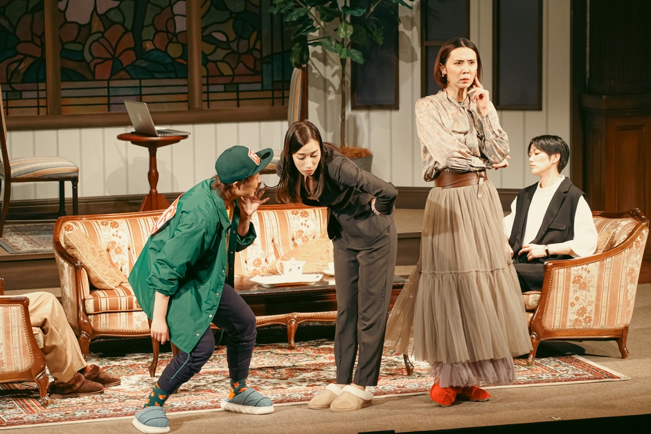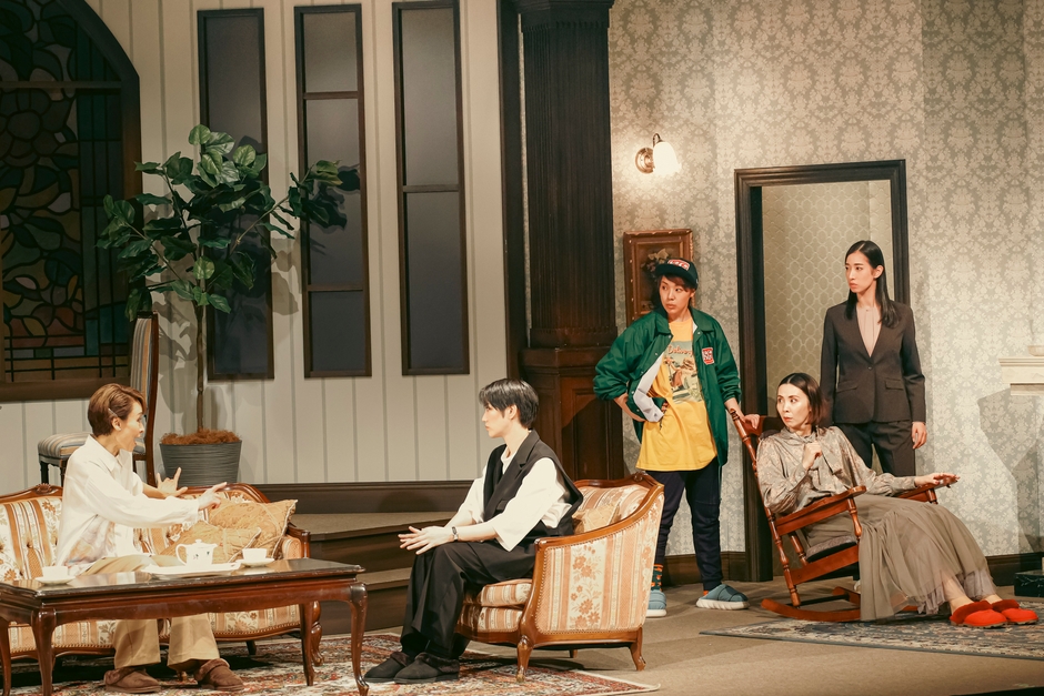 アンティークな絨毯やソファセット、猫足のローテーブルなど、洋館の1室がステージに広がる。この限られた舞台美術のみを駆使して描かれる構成も見どころのひとつだ。