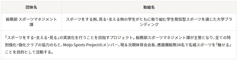 大学スポーツの普及や活性化、大会等における集客・応援促進のための先進的な取組を表彰する。
