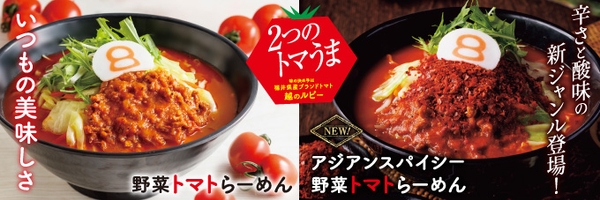 株式会社ハチバン(本社:石川県金沢市、代表取締役社長:長丸 昌功)が展開するラーメンチェーン「8番らーめん」では、全店舗で、愛されて11年目の『野菜トマトらーめん』と、新商品『アジアンスパイシー野菜トマトらーめん』を春に続いて2024年9月2日(月)より期間限定で販売。福井県産ブランドトマト「越のルビー」の「2つのトマうま」をお楽しみください。
