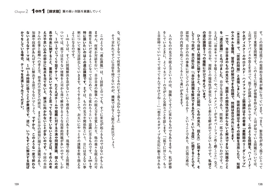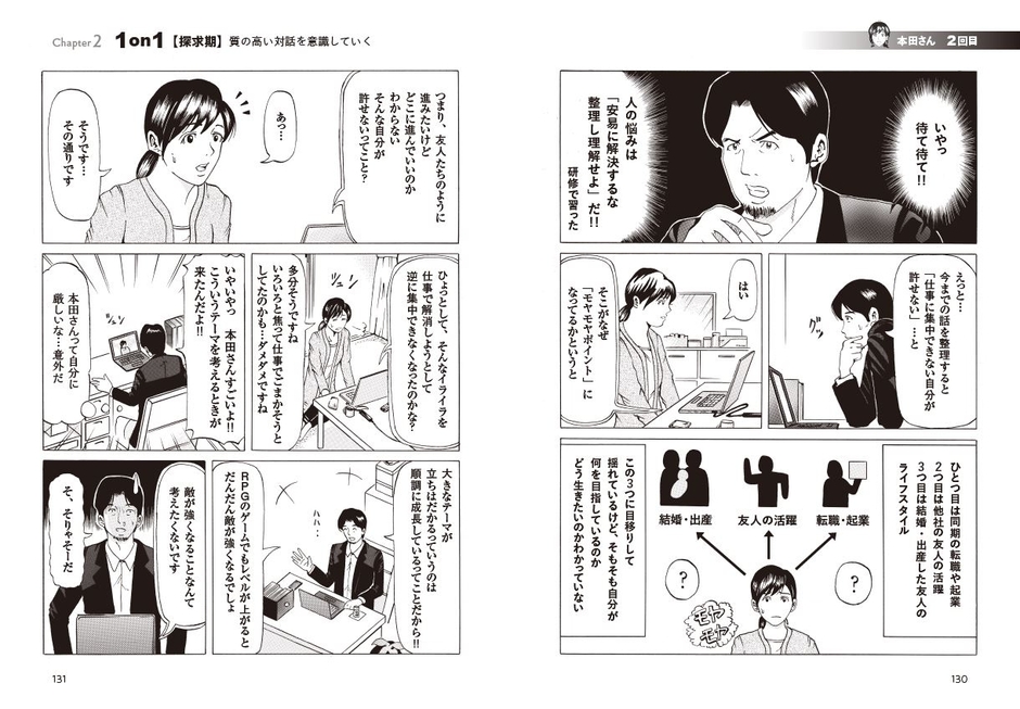 本書では、そんな「第3フェーズ」に入った1on1ミーティングを実りあるものにするために必要なコミュニケーションのポイントを、マンガを中心にわかりやすく解説。