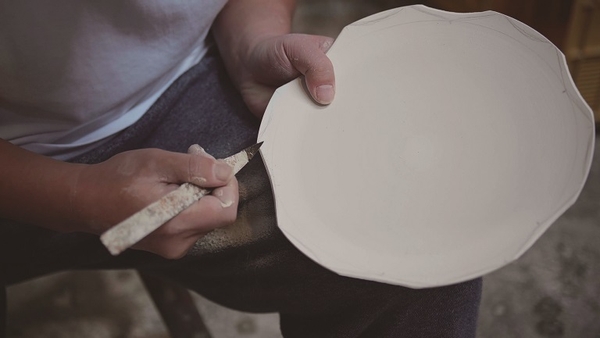 シンプルに図形化する「家紋」など古来の文様から着想を得て、花の輪郭を象った器。京都・清水焼の作家・工房の技術でつくられる繊細かつ実用的な器です。
