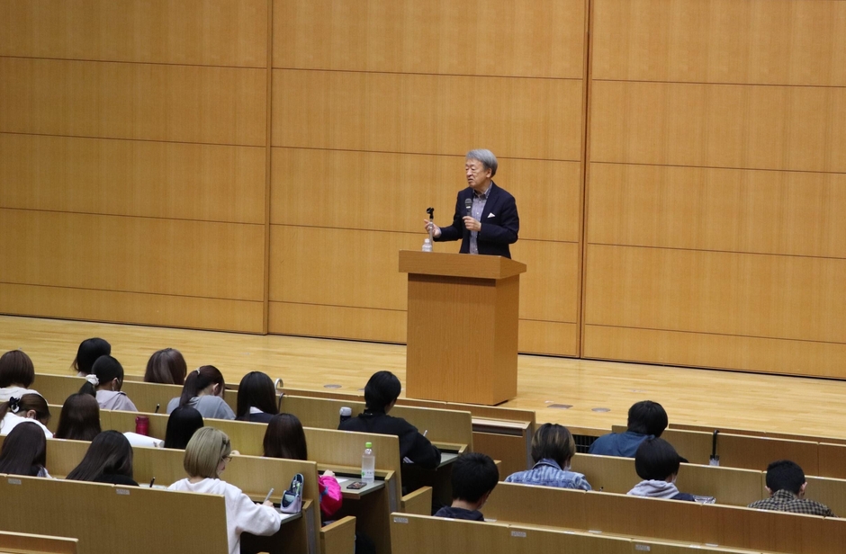 この日の講演のテーマは「君たちはどのような時代を生きるのか:学生時代になすべきこと」。池上教授は、ロシアによるウクライナの軍事侵攻を例に、「国の歴史や背景を知ることが大切」とし、「国際情勢の裏には必ず宗教が関わっている。世界で活躍するために宗教の基礎知識が重要」「世界史・現代史を知ることで、今、歴史の中でどこに立っているのか確認することができる」と説明。グローバル化の時代に必要な社会情勢を学ぶ重要性を力説しました。