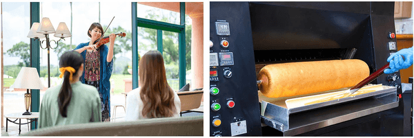 左:バイオリンやピアノなど、生演奏ならではの調べが非日常のひと時に誘います。