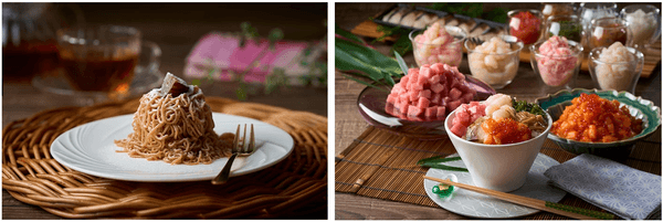 左:お客様の目の前で仕上げる「しぼりたてモンブラン」。マロンクリームを搾る様子を見て楽しんだ後は、搾りたてのクリームならではの軽い口当たりと濃厚な甘さをお楽しみください。