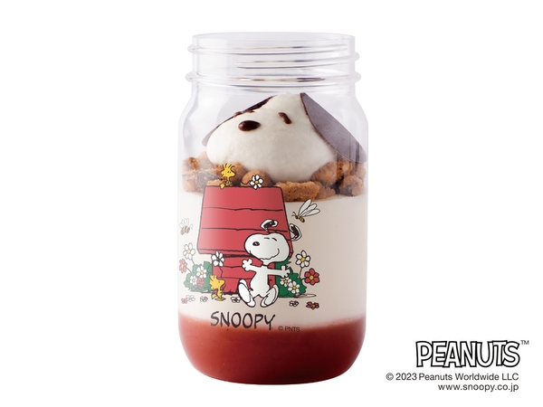 ピーナッツギャングたちがパーティーを楽しむ「スヌーピー in 銀座 2023」のイベントオリジナルアートをプリントした、キュートなガラス瓶入りのフルーツゼリー。