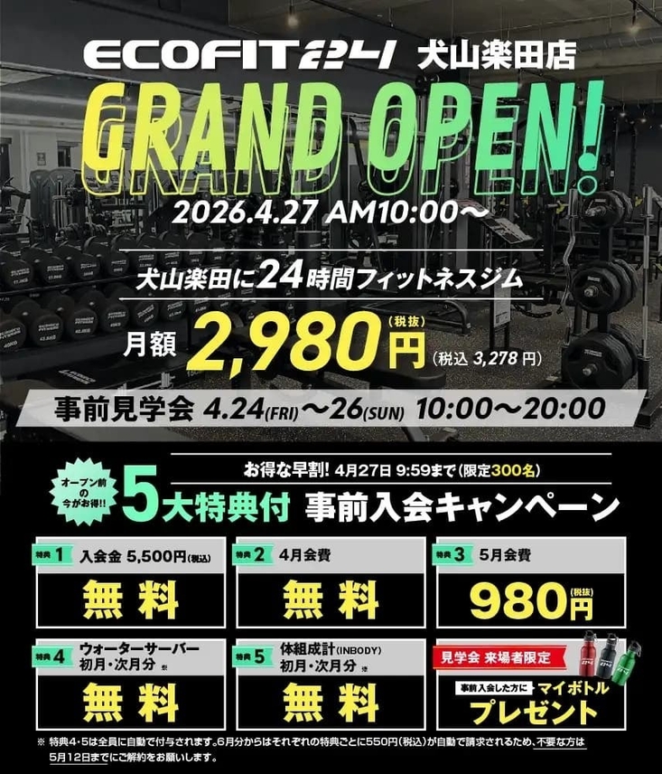 エーイーシー株式会社(本社:愛知県名古屋市、代表取締役:中村康宏)が展開する24時間フィットネスジム「エコフィット24」は、2026年4月27日(月)10:00に「エコフィット24 犬山楽田店」をグランドオープンいたします。