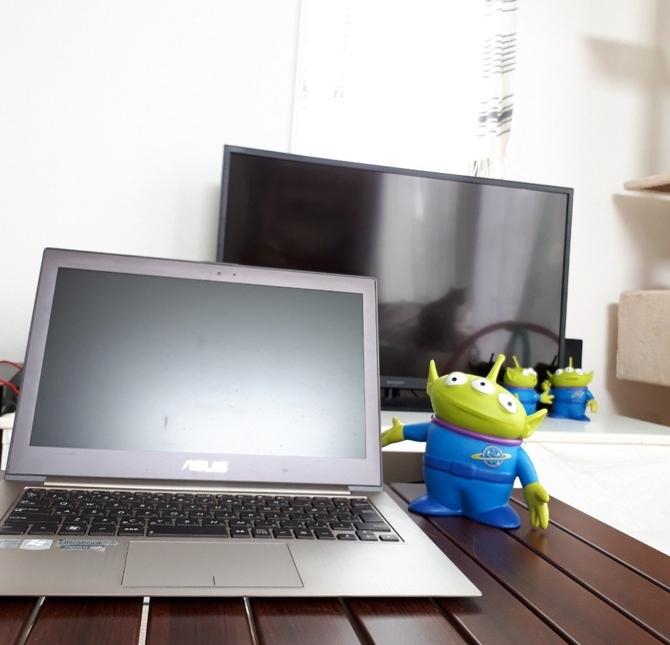 テレビ台の端っこに置いてみたり、パソコンのお友達として置いてみたり。