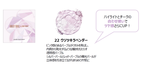 今回の新色は、春らしい透明感ときらめくツヤ肌を叶えるダイヤモンドコレクションとして、2つのカラーが混ざり合う、ダイヤモンドカットの見た目にも美しいデザインです。ローズピンク系の「08 イタズラベリー」は、肌に澄んだ透明感をプラスしてピュアで愛らしい印象に。ピンクレッド系の「09 コイゾラピンク」は、頬にほてったような血色感を与え、抜け感のあるフェミニンな雰囲気に仕上げます。そして、パープル系ハイライトの「22 ウソツキラベンダー」は、くすみを飛ばして内側から発光するようなツヤを与え、肌に奥行きと透明感をもたらします。いずれのカラーもこだわりの偏光パールで、肌に自然になじみながら、ツヤと華やかさを演出します。春のきらめく陽ざしを味方に、心ときめくメイクをお楽しみください。