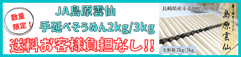 キャンペーン期間中は、「もぐもぐながさき」で「「島原雲仙」手延べそうめん2kg 化粧箱入」「「島原雲仙」手延べそうめん3kg 化粧箱入」「「島原雲仙」手延べそうめん2kg 化粧箱入×2箱セット」「「島原雲仙」手延べそうめん3kg 化粧箱入×2箱セット」の4商品を数量限定で送料お客様負担なしで販売しています。