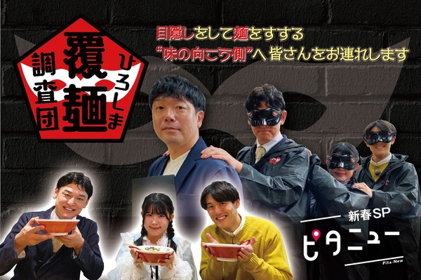 ピタニュー㈭6時台の人気コーナー「ひろしま覆麺調査団」の新春SPバージョン。ラーメンの魅力にとりつかれた芸人てつじ(シャンプーハット)とラーメン大好きな麺バー(メンバー)が広島の麺事情を調査。目隠しをして五感を研ぎ澄ませ1杯のラーメンと向き合う__その様は、まさに究極の麺タ~テインメント! ”味の向こう側” へ、皆さんをお連れします!