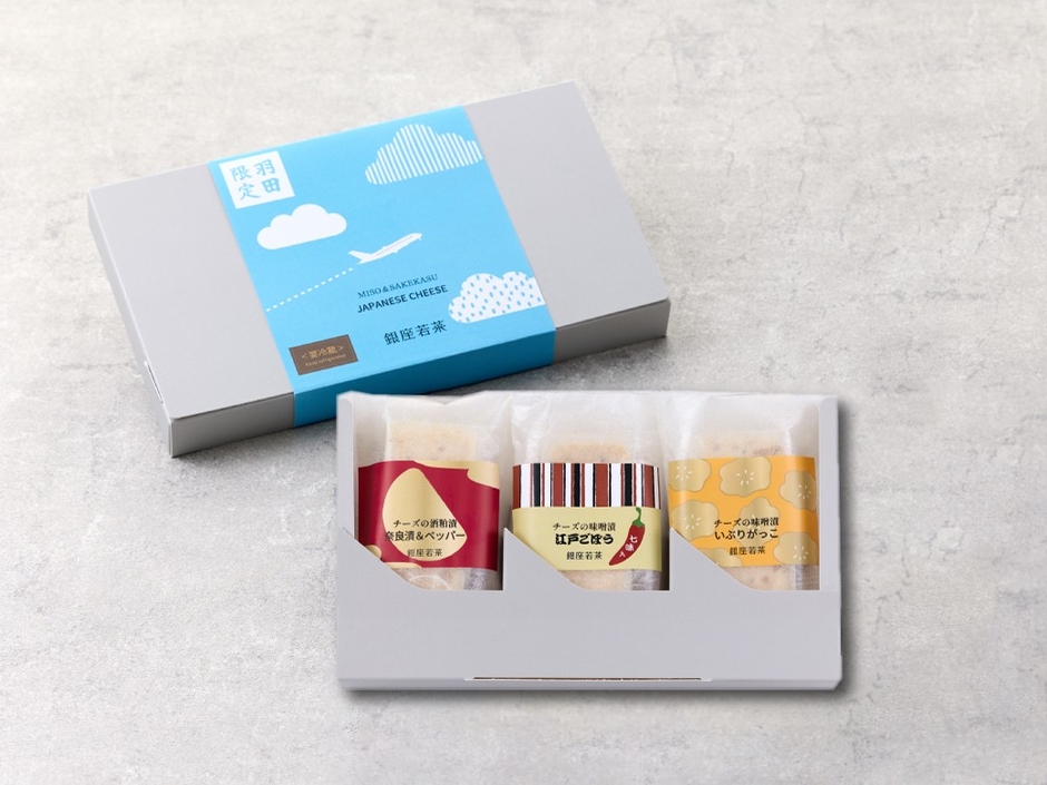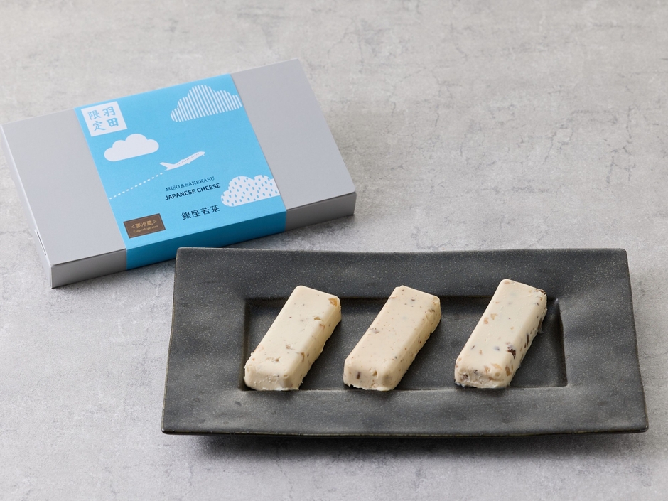 今回新たに登場するのは、銀座若菜の人気商品「チーズの味噌漬」に、羽田空港で東京土産として長年ご好評をいただいている「江戸ごぼう」を組み合わせ、さらに七味唐辛子をアクセントに加えた、おつまみにぴったりの新感覚のチーズです。