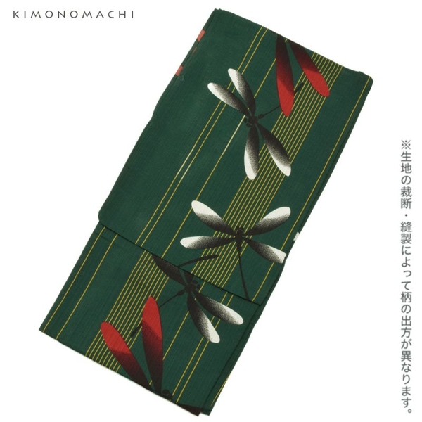 ポリエステル 浴衣単品「縞にトンボ 緑」