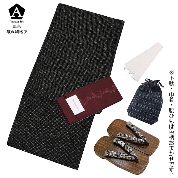 A黒色破れ細格子…浴衣:黒地に白色の細かな破れ格子模様 帯:赤紫色の束ね熨斗柄