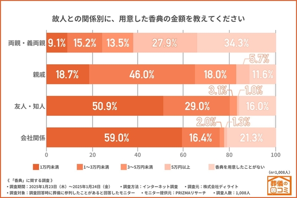 「故人との関係別に、用意した香典の金額を教えてください」と質問したところ、関係別で以下のような回答結果になりました。