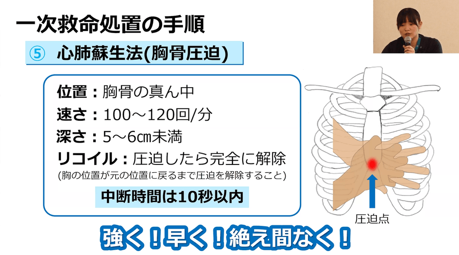 突然の心停止などの緊急事態では、救急車の到着までの数分間の対応が救命率に大きく影響し、その場に居合わせた人による一次救命処置が重要になります。