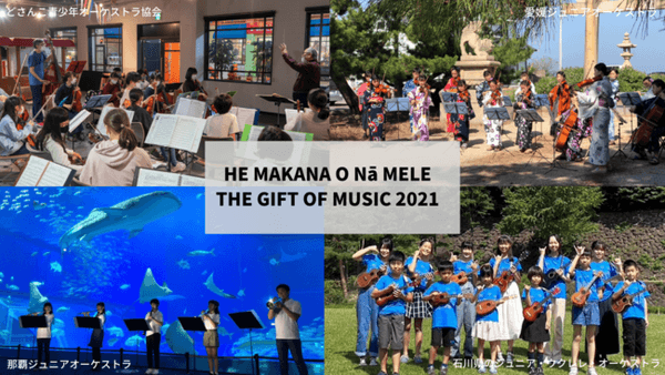 昨年に続き2回目となる2021年は、ハワイ州の姉妹都市である北海道、愛媛県、沖縄県のジュニアオーケストラと、石川県金沢市のジュニア・ウクレレ・オーケストラが参加し、日本から総勢120名の子供たちがチャリティコンサートに出演します。姉妹3都市のジュニアオーケストラは、『リリウオカラニ女王のソングブック』序曲を協奏し、石川県のジュニア・ウクレレ・オーケストラは、ウクレレ奏者のジェイク・シマブクロ氏とハワイ・ユース・シンフォニーの管弦楽団と「イチゴイチエ(Ichigo Ichie)」を演奏します。そして最後は全員でジェイク・シマブクロ氏とハワイアン女性シンガーのエイミー・ハナイアリイ氏、ハワイ・ユース・シンフォニーのジャズバンドと管弦楽団と共に、人気のフラソング「ハレイワ・フラ(Haleiwa Hula)」を協演します。編曲はハワイ・ユース・シンフォニー卒業生で作曲家として高く評価されているマイケル・トーマス・フーマイ氏が担当しました。