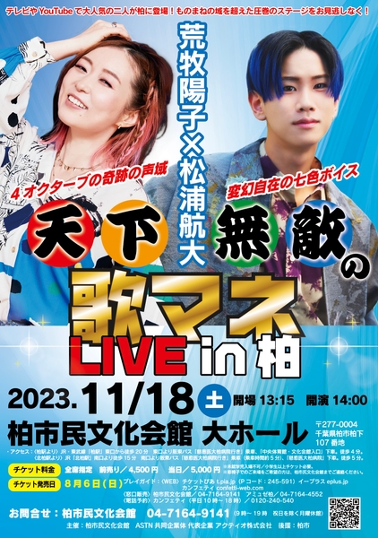 柏市民文化会館(ASTN共同企業体 代表企業アクティオ株式会社)主催、『天下無敵の歌マネLIVE in 柏』が2023年11月18日 (土)に柏市民文化会館 大ホール(千葉県柏市柏下107)にて開催されます。