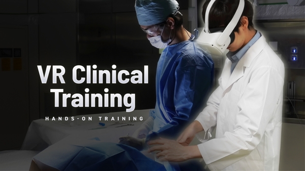 VRハンズオンは、リアルな実写360度の治療映像の名医の手技に、ハンドトラッキングセンサーによって表示されたプレイヤーの手を重ね、CG空間では味わえないリアリティーのある空間体験と実践演習を同時に行うことができる、世界初の実写VR実習評価ソリューションです。ポイントとなる箇所で視線や手の位置、傾きなどを判定しプレイヤーの習熟度を評価することで、繰り返しVR実習を継続したくなるモチベーションの維持、向上を実現しています。