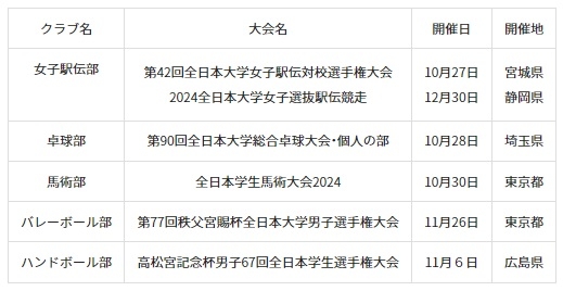 体育会主催の全国大会出場クラブの壮行会が10月17日、天白キャンパスタワー75の2階学生ホールで行われました。女子駅伝部、馬術部、卓球部、ハンドボール部、バレーボール部の5クラブの代表が「大会では少しでも多く勝って、いい結果を残せるように頑張りたい」「支援していただいた皆さんに結果で恩返しをしたい」などと晴れの舞台での健闘を誓いました。