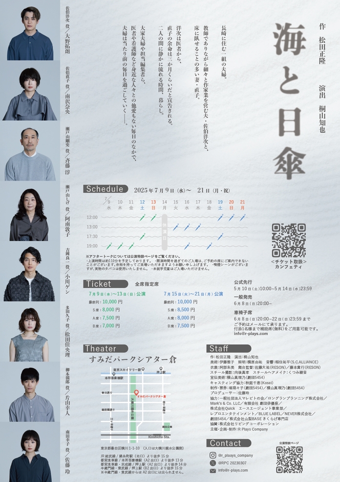 R Plays Company主催、『海と日傘』が2025年7月9日 (水) 〜 2025年7月21日 (月・祝)にすみだパークシアター倉(東京都墨田区横川1-1-10)にて上演されます。 チケットはカンフェティ(運営:ロングランプランニング株式会社、東京都新宿区、代表取締役:榑松 大剛)にて6月8日(日)20:00より発売開始です。