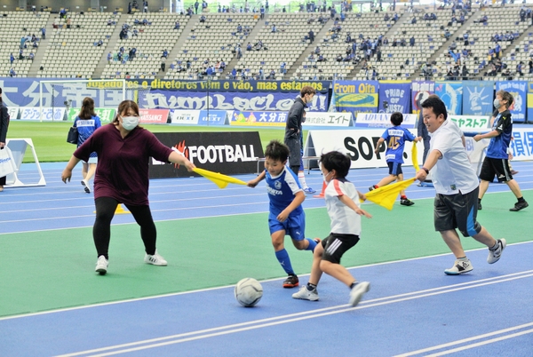 当日はJFA公認指導者ライセンスを持つ大分トリニータのスクールコーチを講師としてお招きし、大分トリニータのホームスタジアムである昭和電工ドーム大分にて本教室を行いました。参加した12組の小学生と保護者の方たちは、体をほぐすメニューから脳と体を連携させる運動、ビブスを持ったペアでゴールを狙う手つなぎサッカーまで、普段トリニータの試合が行われるフィールド横で約1時間のトレーニングを楽しみました。