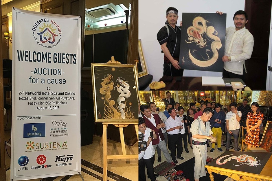 フィリピンの“ドゥテルテ・キッチン”一筆龍チャリティオークションでの約1000万円の落札金額全てをストリートチルドレンの為に寄付させていただき、そのご縁からマニー・パッキャオ様にフィリピンの議員会館にて一筆龍の描写実演と贈呈をさせていただきました。