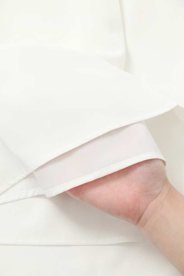 裏地を付け2枚仕立てにすることで気になるインナーの透け感を軽減します。また、表地は繊細で上品な光沢感と柔らかな肌触りで、ドレープ性のある生地を採用し美しいシルエットをキープします。