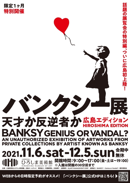 株式会社広島ホームテレビ(所在地:広島県広島市、代表取締役社長:三吉 吉三)と、公益財団法人ひろしま美術館(所在地:広島県広島市、 館長・理事長:池田 晃治)は、主催で2021年11月6日(土)~2021年12月5日(日) の期間、「バンクシ―展 天才か反逆者か 広島エディション」を限定1ヵ月 特別に開催いたします。