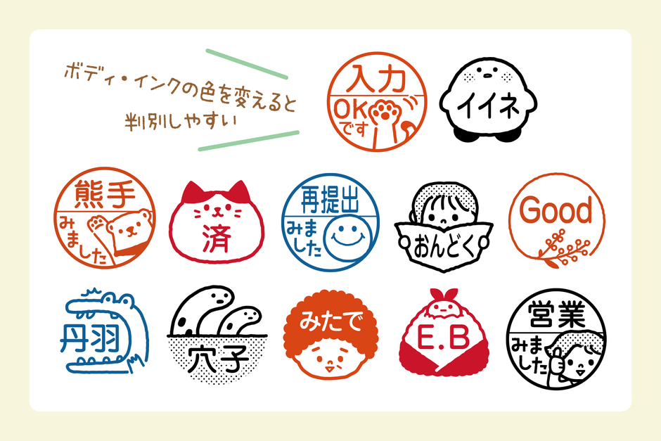 えらべる楽しさと便利さをかなえる全9色のボディカラー。用途や印面のデザインごとに色をかえたり、内容に合わせて色分けをすることもできます。