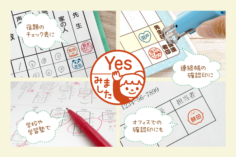 2023年1月に販売開始した「みましたスタンプ」。お子さまの連絡帳や音読カードのサイン、塾や学校の先生が提出物に押す確認印に使える、かわいいイラスト入り印鑑です。回覧板のサインやオフィスでのチェック印などにもオススメです。
