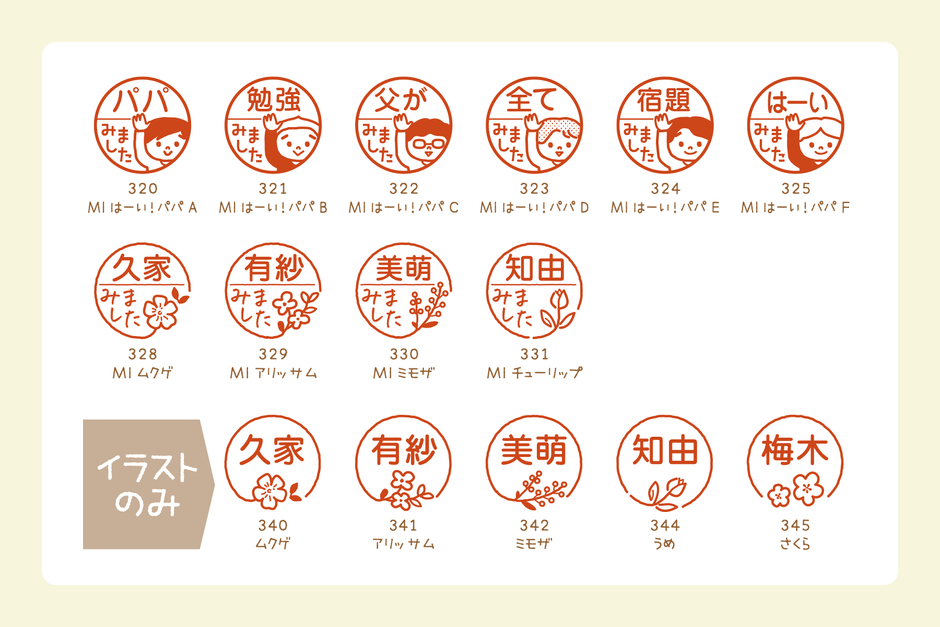 「みました」「OKです」などの文字入りデザインに加え、名前のみを入れられるタイプも揃え、用途に合わせて選べます。