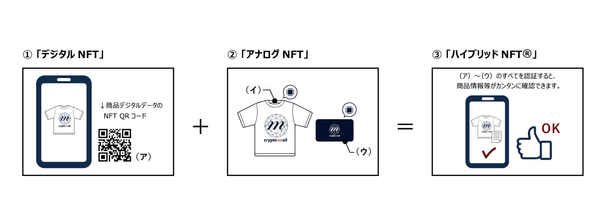 「ハイブリッドNFT(R)」とは、「デジタルNFT」と「アナログNFT」を組み合わせたものをいいます。それら2点以上を認証させることにより、「模倣品」問題を100%解決する仕組みを発明いたしました。