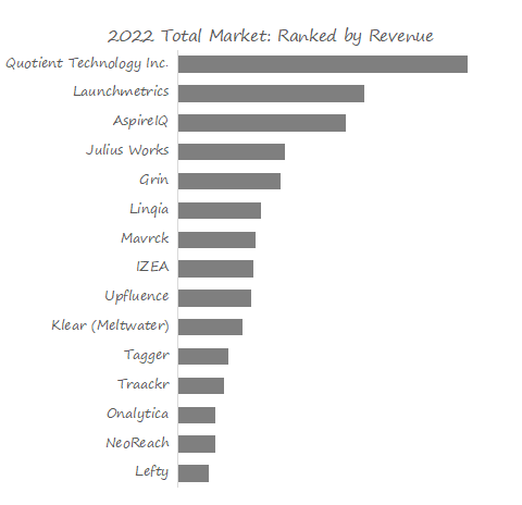インフルエンサー・マーケティング・プラットフォームの世界の主要メーカーには、Quotient Technology Inc. Launchmetrics、AspireIQ、Julius Works、Grin、Linqia、Mavrck、IZEA、Upfluence、Klear(Meltwater)などである。2022年、世界の上位5社の売上高シェアは約23.0%であった。