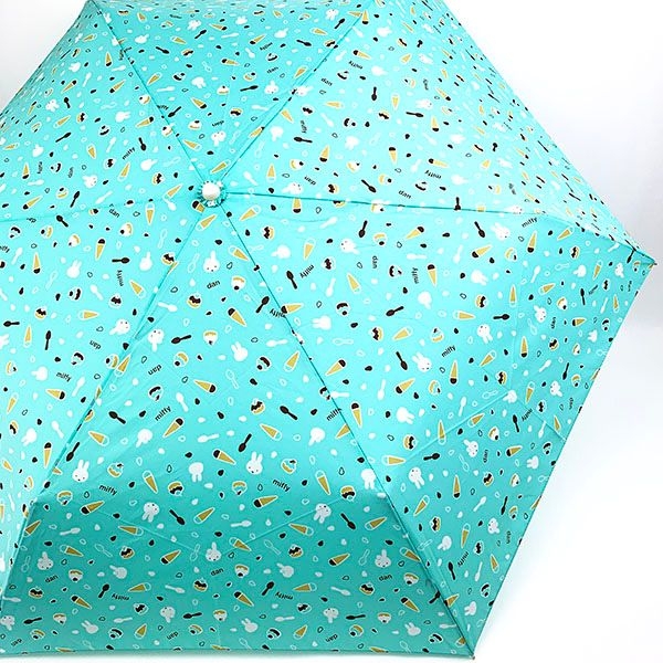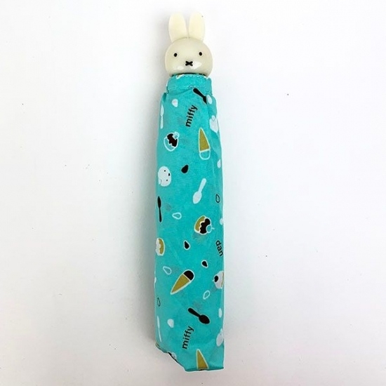 まずは、持ち手にミッフィーのお顔が付いたデザインの雨傘です。ミントカラーが梅雨の季節にもピッタリですね。ミッフィーのお顔の他に、スイーツが散りばめられたデザインです。