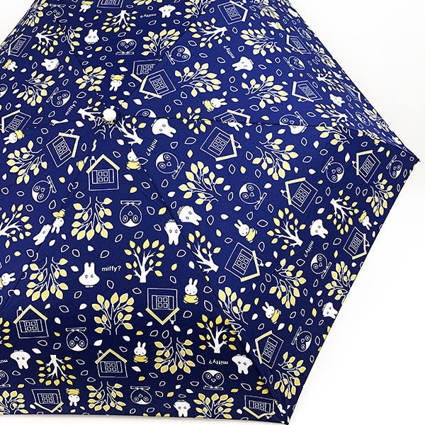 こちらもオススメの、晴雨兼用の折り畳み傘です。65周年デザインで、持ち手はシンプルなブラック。ネイビー地にミッフィーのフェイス総柄です。