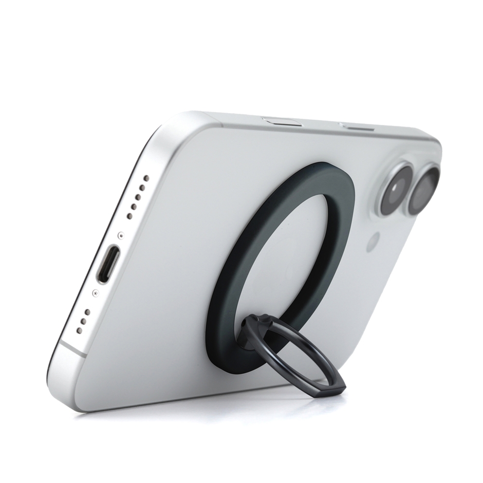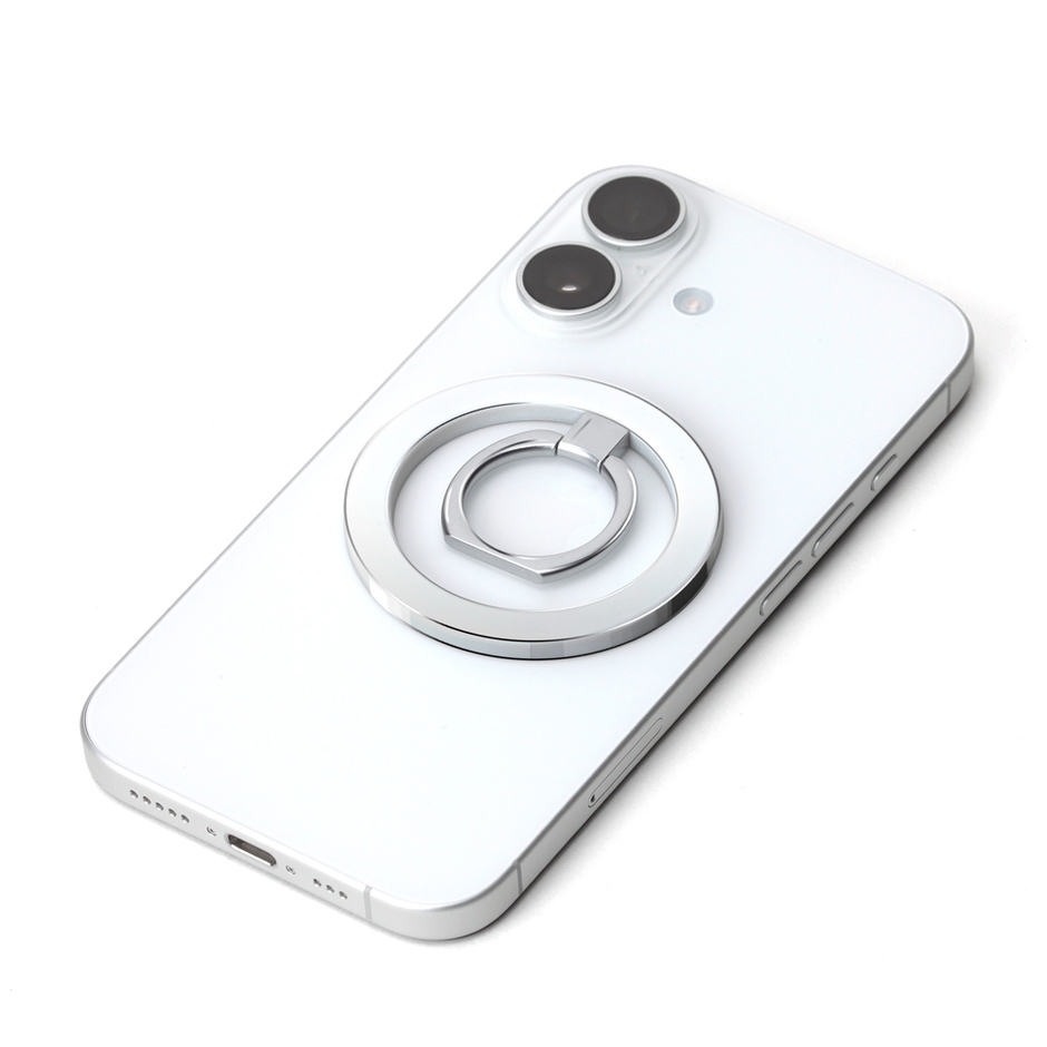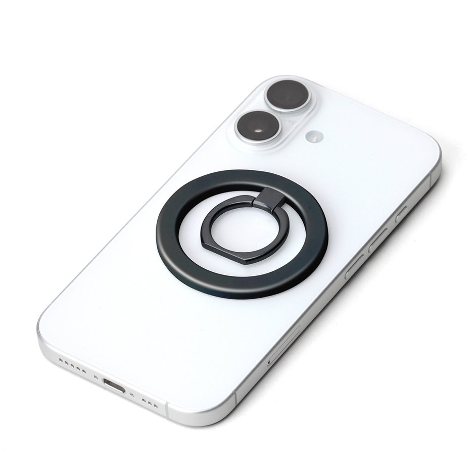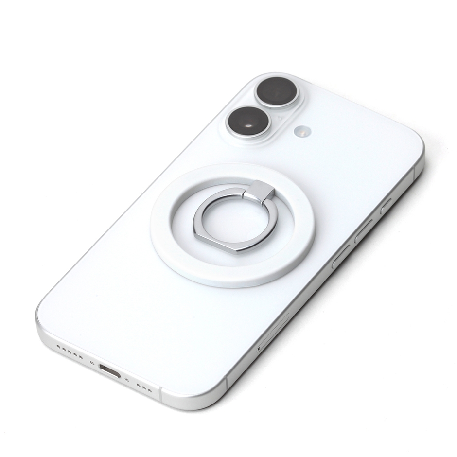 本商品は、MagSafe機能をもつスマートフォンに、強力な磁力でピタッとくっついてスマホを持ちやすくするリングホルダーです。