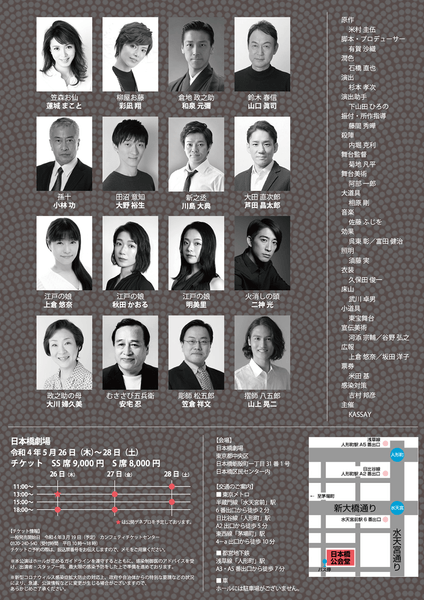 「日本の文化をステージに!」をコンセプトに舞台を創り続けるKASSAYが贈る、正当派時代劇。元宝塚男役スター蓮城まこと・彩凪翔をはじめ、狂言師の和泉元彌など多様なジャンルから俳優陣が集結しました。