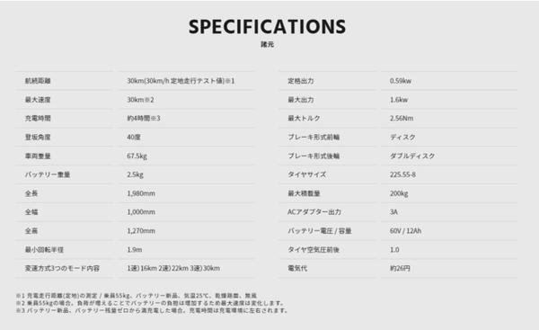 オプションの大容量バッテリーを使えば、約60kmの走行が可能で、その際の充電に掛かる電気代は約65円です!