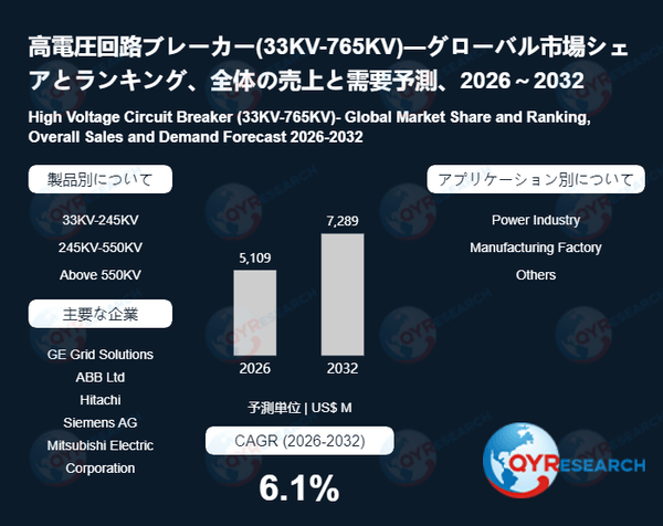 QYResearchが発表した新たな市場調査レポート「高電圧回路ブレーカー(33KV-765KV)―グローバル市場シェアとランキング、全体の売上と需要予測、2026~2032」によると、世界の高電圧回路ブレーカー(33KV-765KV)市場規模は2025年の約4843百万米ドルから2026年の5109百万米ドルへと順調に拡大すると見込まれ、予測期間中は年平均成長率(CAGR)6.1%で成長し、2032年には7289百万米ドルに達すると予測されている。