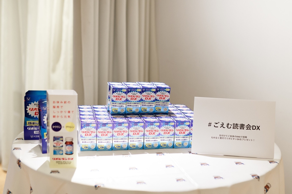 3月4日にごえむ読書会DXを実施いたしました。95名の対面参加者とオンライン参加者300名に対しリポビタンDXの紹介をし、対面参加者にはサンプリングを行い、リポビタンDXと「朝の持ち越し疲労」について理解を深めてもらう活動を行いました。