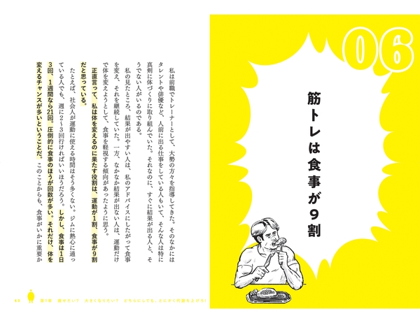 そこで本書では、食べるべき食材と、そのタイミング、食事の際のコツなど、日常生活のなかで簡単に取り入れられる工夫を中心にお伝えすることで、計算や管理などをしなくても、筋肉がつく食事の仕方を解説していく。